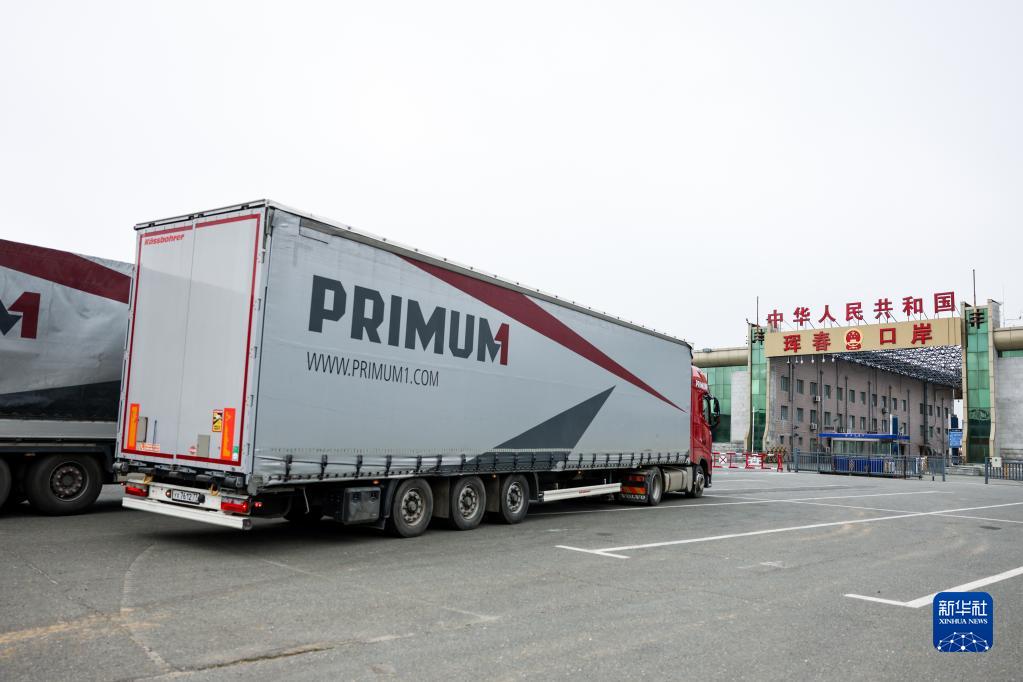 6月26日,貨車(chē)在琿春公路口岸排隊等待通關(guān)。