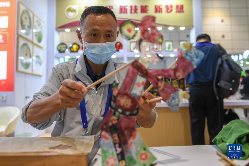 6月27日,在第四屆全國殘疾人展能節上,來(lái)自山西的胡發(fā)偉現場(chǎng)展示皮影雕刻作品。