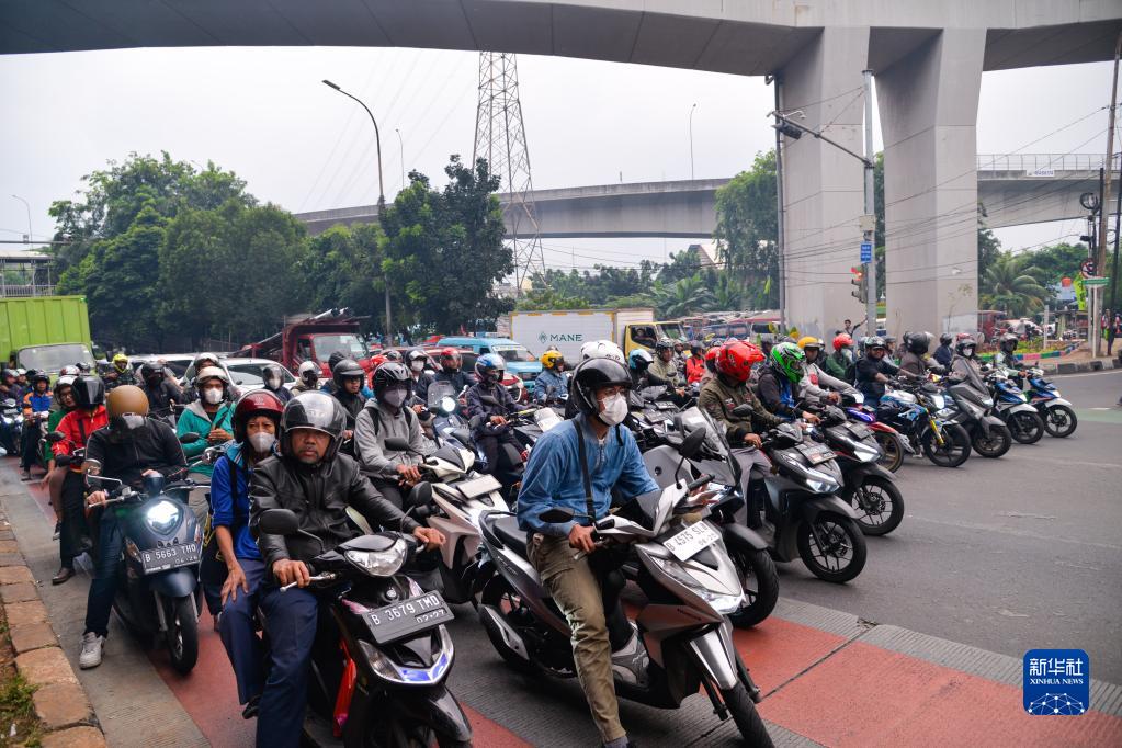 6月27日傍晚,在印度尼西亞雅加達東區的芝皮南切姆佩達克,人們在雅加達-萬(wàn)隆出城方向路口等待綠燈。
