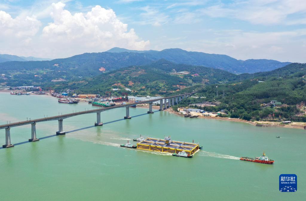 6月27日,“寧德1號”在拖輪協(xié)助下駛向霞浦北礵島海域養殖區(無(wú)人機照片)。