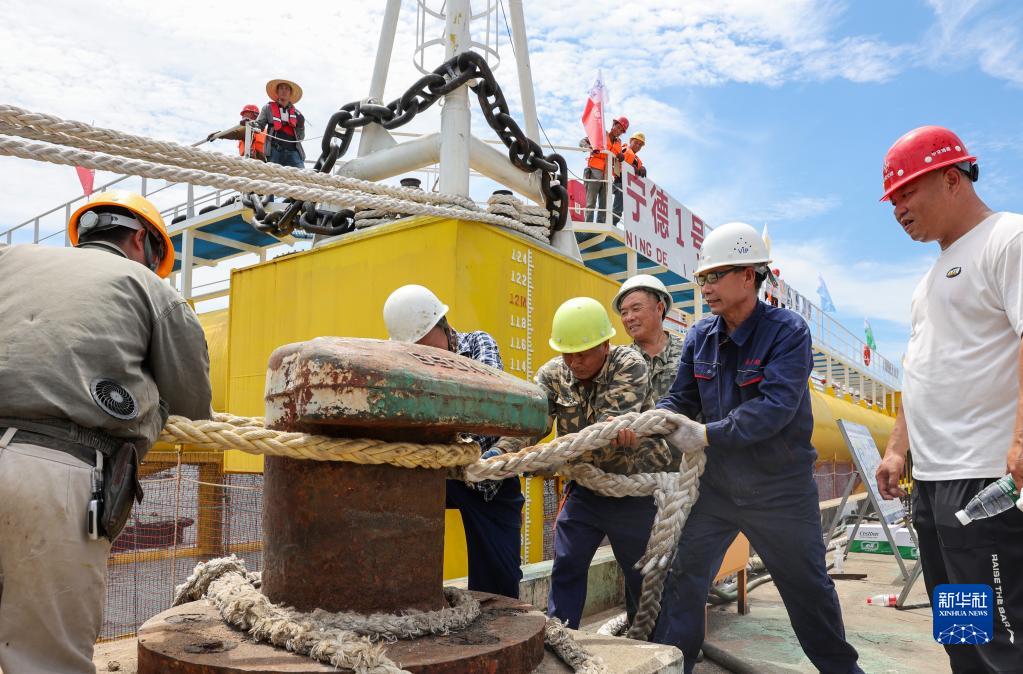 6月27日,作業(yè)人員施放“寧德1號”錨定纜繩,準備拖航。