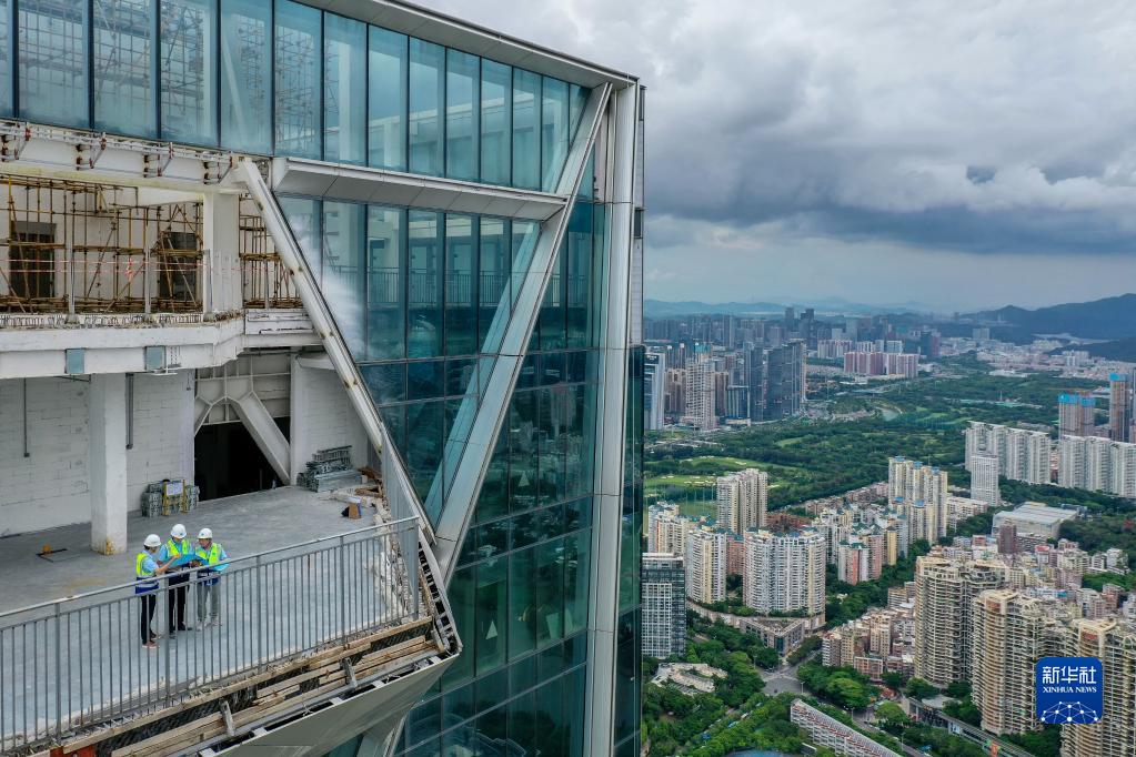伍濤(中)和同事在350米高處的深灣匯云中心空中平臺研究這里的空間裝飾設計(無(wú)人機照片,6月26日攝)。