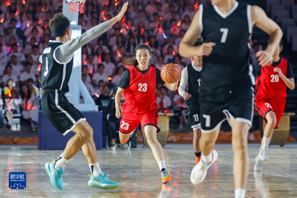 6月28日,成都街頭籃球隊夜幕大源籃球隊(黑)與四川師范大學(xué)女子籃球隊(紅)在活動(dòng)中進(jìn)行友誼賽。