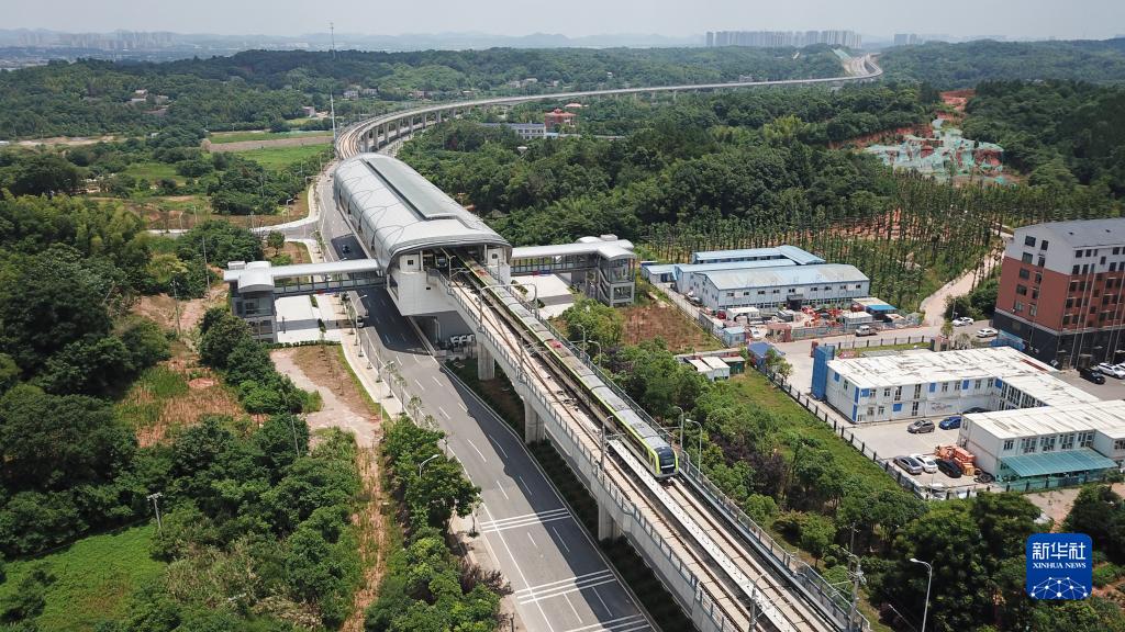 6月28日,列車(chē)駛進(jìn)長(cháng)株潭城際軌道交通西環(huán)線(xiàn)一期工程的高架站點(diǎn)雙湖站(無(wú)人機照片)。