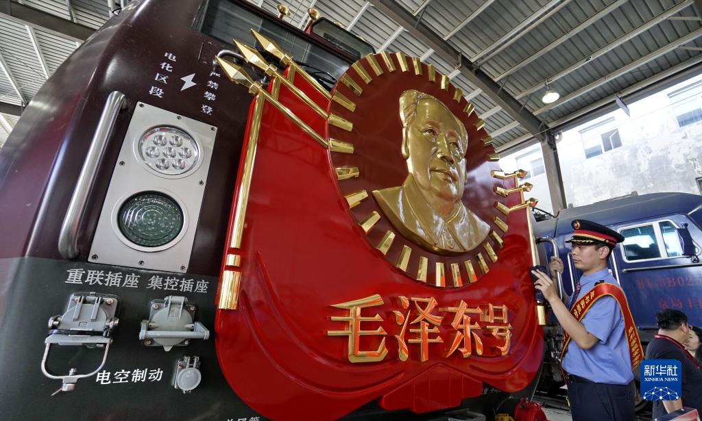 6月28日,“毛澤東號”機車(chē)駕駛員在參加完表彰儀式后擦拭機車(chē)。新華社記者 李欣 攝