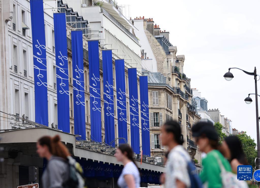 6月28日,人們走過(guò)法國巴黎街頭的打折季廣告。