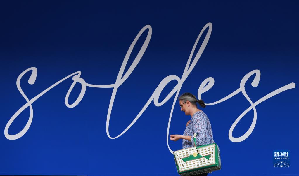 6月28日,一名女子走過(guò)法國巴黎街頭的打折季廣告。
