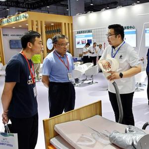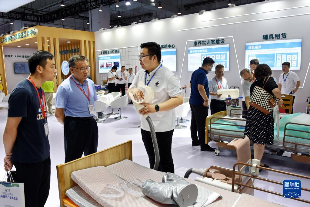 6月29日,參觀(guān)者在展會(huì )上了解居家養老護理設備。