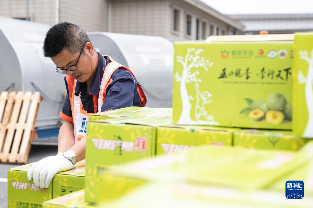 6月28日,在重慶巫山機場(chǎng),機場(chǎng)工作人員把即將由中國郵政航空公司全貨機運送的巫山脆李裝車(chē)。