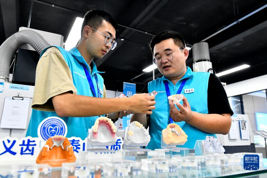 6月29日,在日照高新技術(shù)產(chǎn)業(yè)開(kāi)發(fā)區生命大健康產(chǎn)業(yè)園,工作人員在討論研發(fā)義齒。