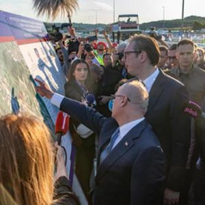 6月28日,塞爾維亞首都貝爾格萊德,塞爾維亞總統武契奇(中)在中企承建的貝爾格萊德繞城高速公路路段通車(chē)儀式現場(chǎng)觀(guān)看展板。