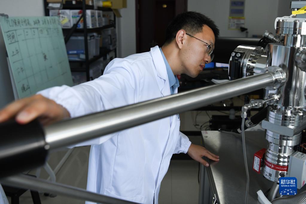 6月28日,在中科院合肥物質(zhì)科學(xué)研究院強磁場(chǎng)科學(xué)中心實(shí)驗室,郝林向脈沖激光分子束外延系統中傳送樣品。