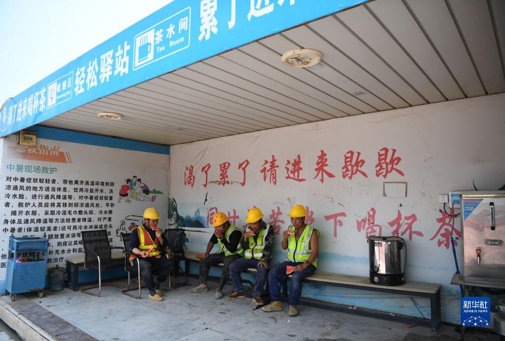 6月29日,在中建三局承建的中山大學(xué)附屬第三醫院嶺南醫院二期項目工地,工人在驛站吃西瓜。