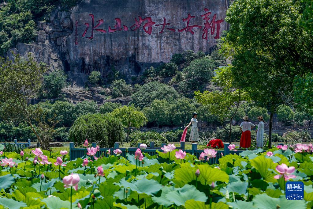6月28日,游客在安徽省黃山市屯溪區新安江濕地公園游玩賞荷。