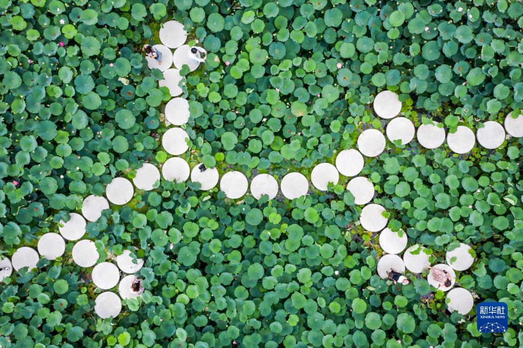6月27日,游客在浙江省溫嶺市澤國鎮橋伍村荷塘中賞花(無(wú)人機照片)。