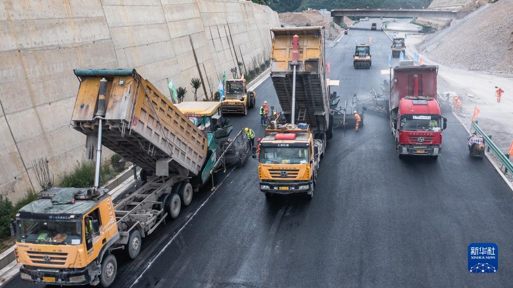 6月29日,中鐵十二局工人在貴金古高速公路清池至古藺段進(jìn)行路面施工(無(wú)人機照片)。