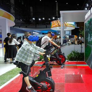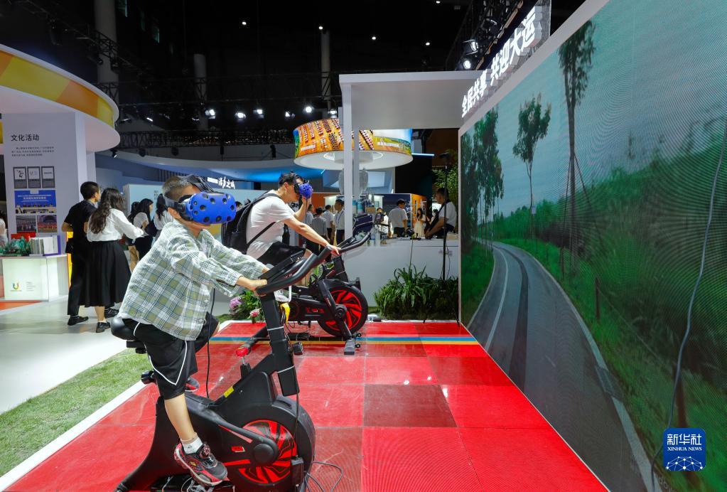 6月29日,在第十九屆中國西部國際博覽會(huì )的“一帶一路”國際合作館,一對父子在體驗天府綠道VR騎行。