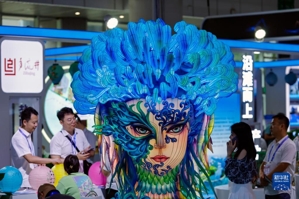 6月29日在第十九屆中國西部國際博覽會(huì )的成渝地區雙城經(jīng)濟圈建設館的自貢展區拍攝的精衛女神彩燈。