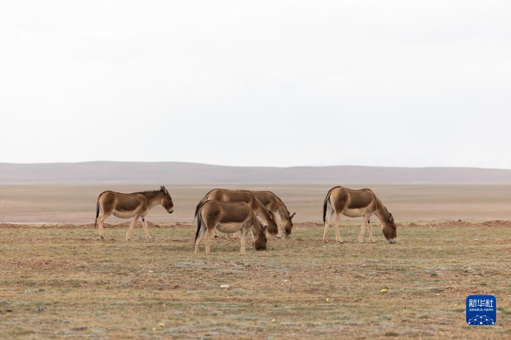 6月15日,在長(cháng)江源地區的楚瑪爾河附近,幾只藏野驢在覓食。新華社記者金立旺攝