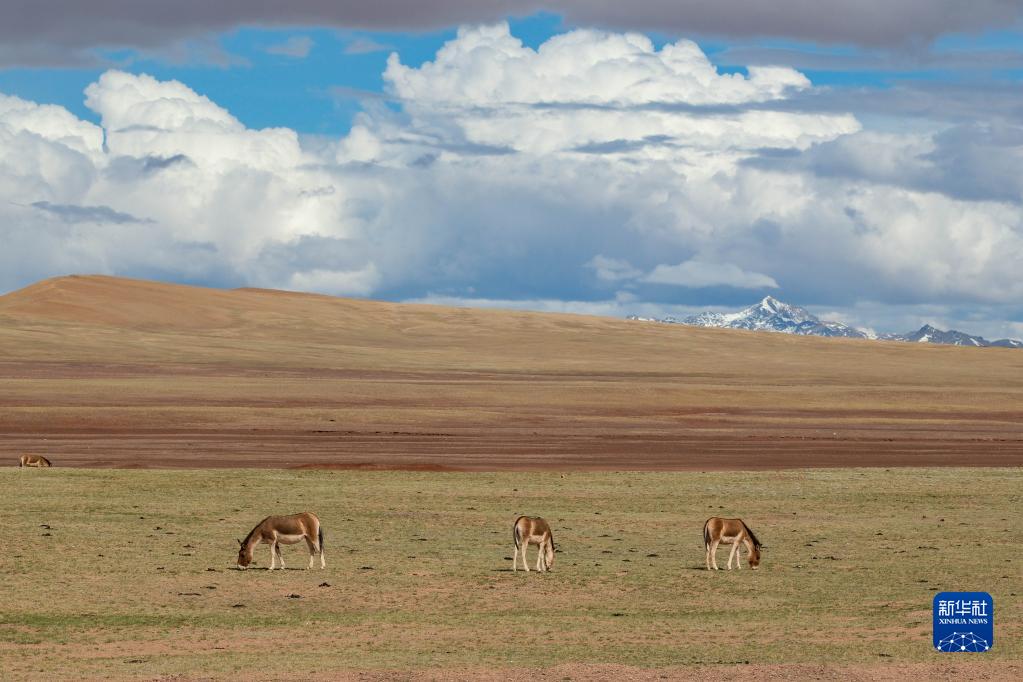6月14日,在長(cháng)江源地區的沱沱河附近,幾只藏野驢在覓食。新華社記者張鋮攝