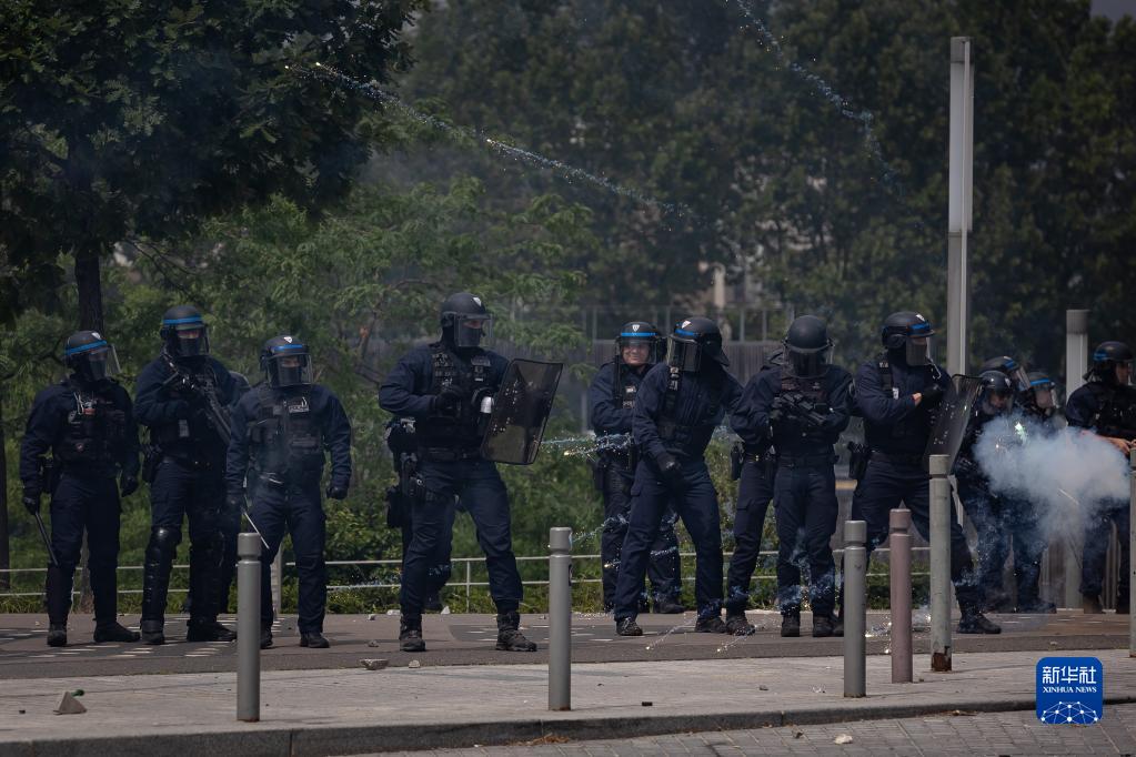 6月29日,在法國上塞納省楠泰爾市,警察在騷亂現場(chǎng)警戒。