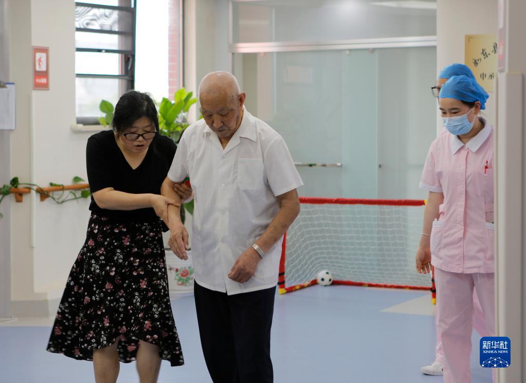 6月29日,在如東縣申丞護理院,工作人員攙扶老人行走。