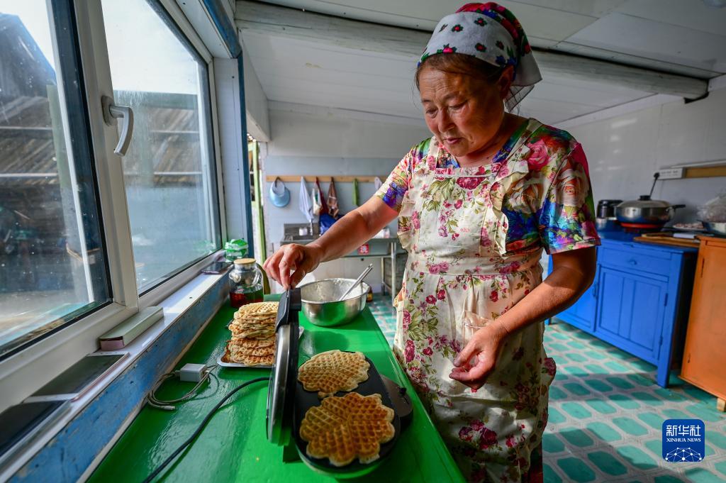 6月28日,考占花在烤制華夫餅??颊蓟ㄊ嵌砹_斯族,2004年開(kāi)始經(jīng)營(yíng)俄羅斯族家庭游。