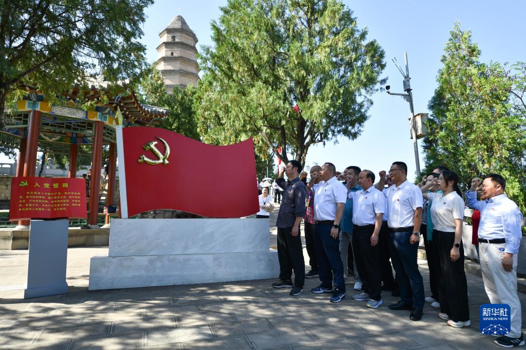 6月30日,在延安寶塔山參觀(guān)的黨員干部重溫入黨誓詞。