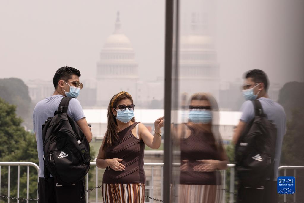 6月29日,在美國首都華盛頓,游客戴著(zhù)口罩在華盛頓紀念碑游覽,遠處的國會(huì )大廈籠罩在煙霧中。