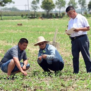 6月28日,在太和縣淙祥現代農業(yè)種植專(zhuān)業(yè)合作社的高產(chǎn)攻關(guān)示范田里,徐淙祥(右)和兒子徐?。ㄗ螅?、孫子徐旭東查看新品種大豆的出苗情況。