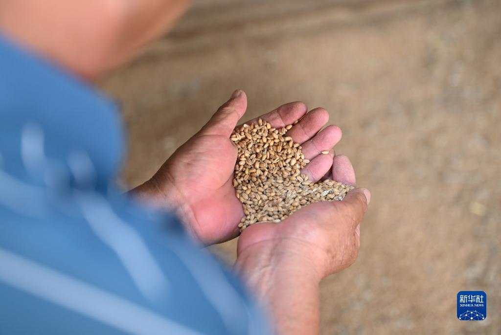6月8日,徐淙祥在太和縣淙祥現代農業(yè)種植專(zhuān)業(yè)合作社查看收獲的小麥。