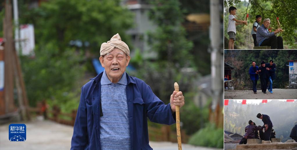 拼版照片:左圖為廣西融水苗族自治縣桿洞鄉烏英苗寨83歲的老黨員梁玉平(2023年6月28日攝);右上圖為梁玉平指導小學(xué)生吹蘆笙;右中圖為梁玉平(中)和后輩們在苗年活動(dòng)中(2019年12月27日攝);右下圖為梁玉平(站立者)在苗寨新春民俗活動(dòng)中(2019年2月5日攝)。