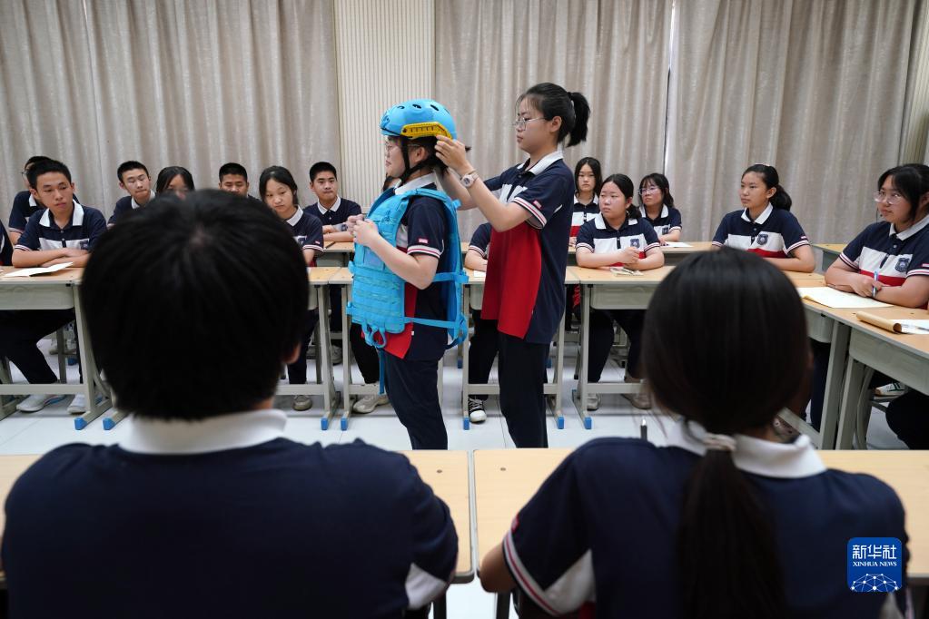 6月30日,河北省邢臺市第八中學(xué)學(xué)生練習使用救生衣。