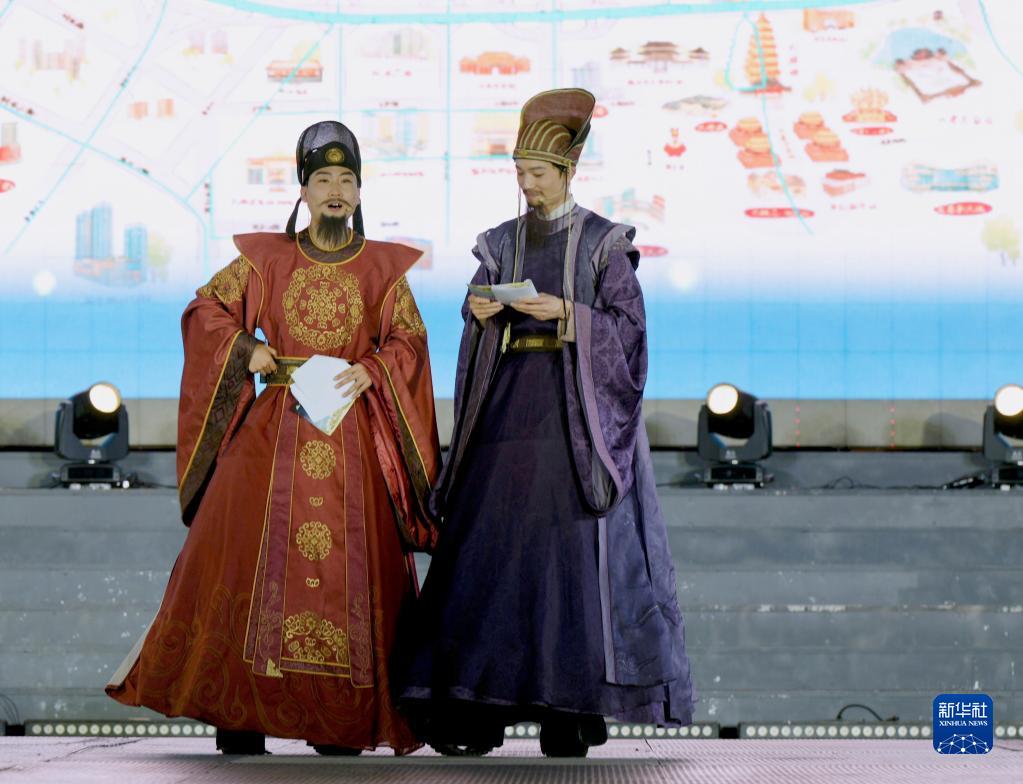6月29日晚,西安大唐不夜城互動(dòng)節目“盛唐密盒”的演員現場(chǎng)推介夜間消費季活動(dòng)。