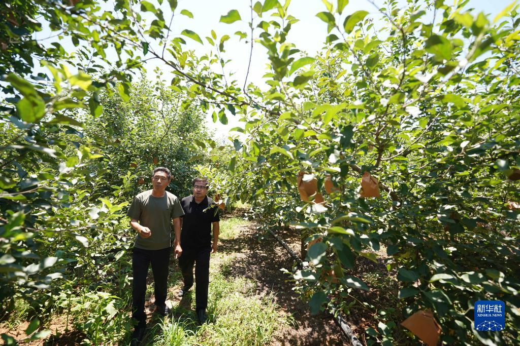 6月30日,賈志華(右)與隊員梁國軍查看蘋(píng)果長(cháng)勢。