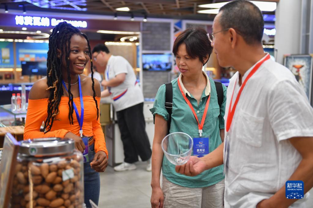 6月30日,在中非經(jīng)貿合作促進(jìn)創(chuàng )新示范園(湖南高橋大市場(chǎng)),來(lái)自貝寧的志愿者米貝拉(左一)向參觀(guān)者介紹展品。