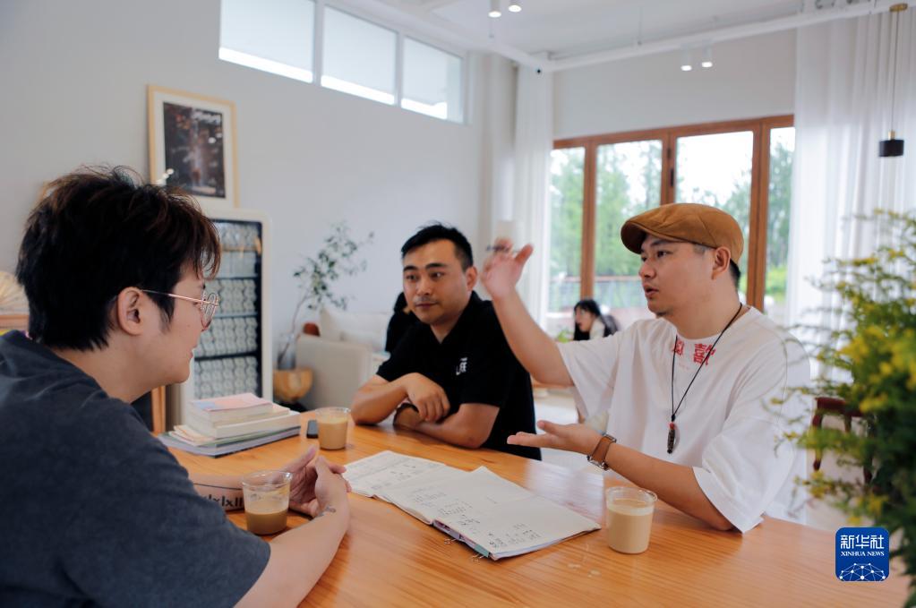 6月30日,在如東無(wú)名之輩咖啡店,店主陳維華(右)與合伙人商討分店的設計方案。