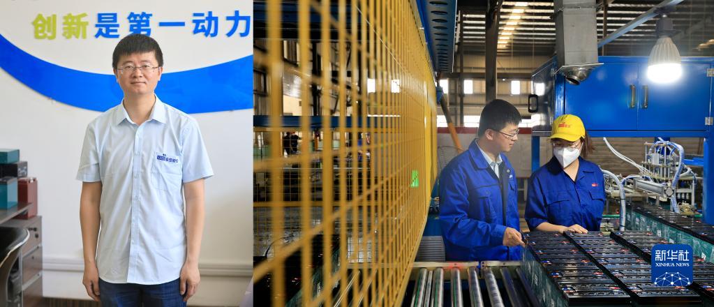 拼版照片:左圖為6月27日拍攝的江蘇海寶新能源有限公司技術(shù)部部長(cháng)楊海濤;右圖為6月27日,楊海濤在蓄電池組裝車(chē)間了解新產(chǎn)線(xiàn)設備運行調試情況。