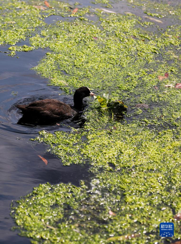 6月29日,一只白骨頂在英國倫敦泰晤士河一處浮萍中覓食。