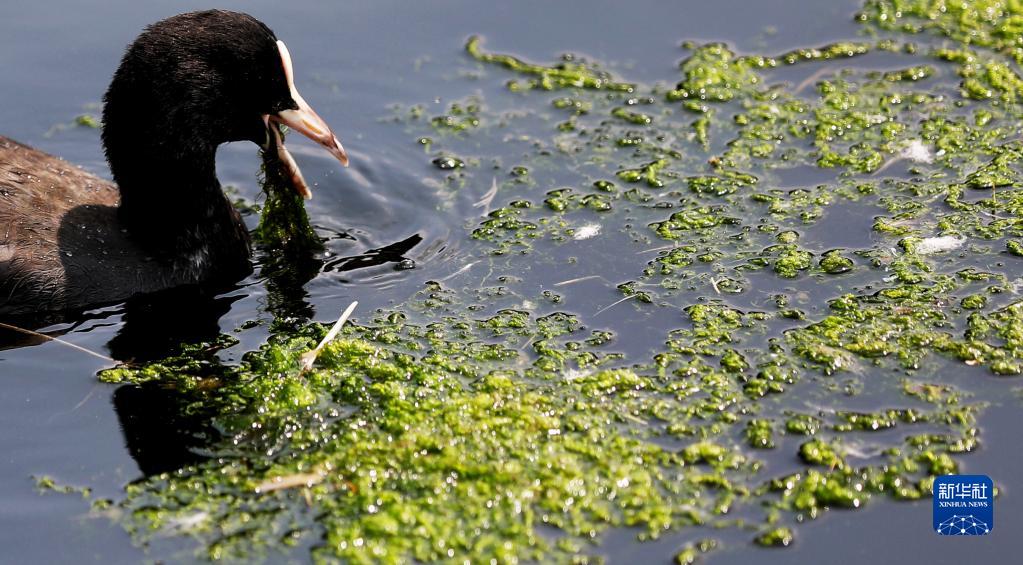 6月29日,一只白骨頂在英國倫敦泰晤士河一處浮萍中覓食。