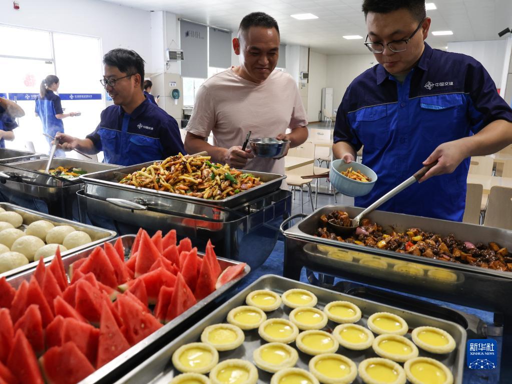 中交路建黃茅??绾Mǖ理椖坎繂T工在食堂就餐(6月29日攝)。