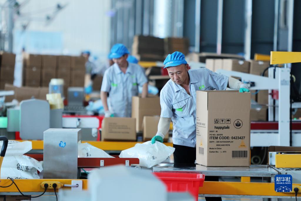 6月30日,在山東辛化硅膠有限公司,工人在包裝出口的貓砂產(chǎn)品。