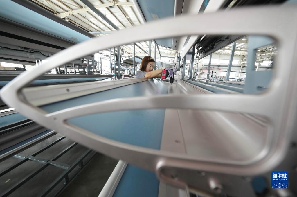 7月1日,工人在河北省唐山市豐潤區一家動(dòng)車(chē)組列車(chē)配件企業(yè)的生產(chǎn)車(chē)間工作。