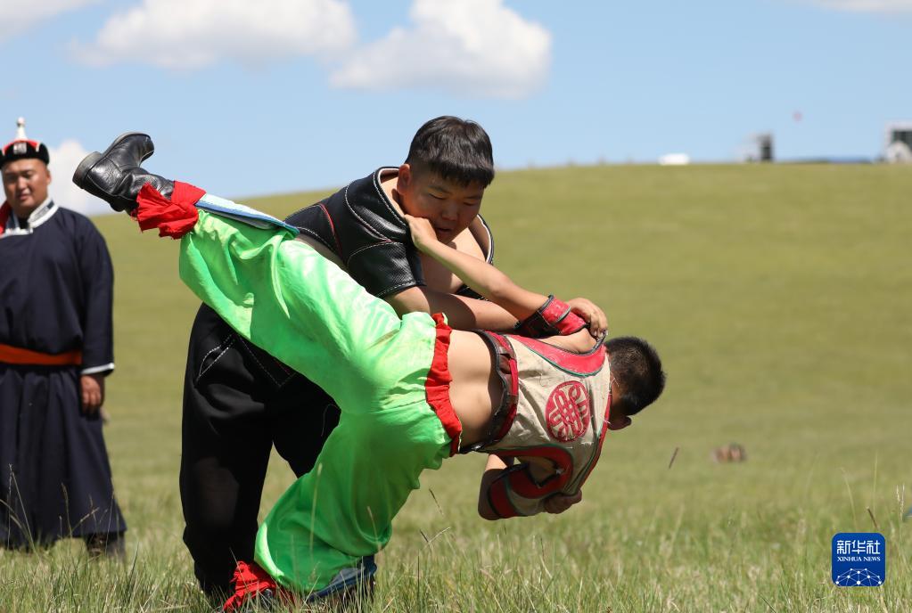 7月1日,小選手們在草地上參加搏克比賽。