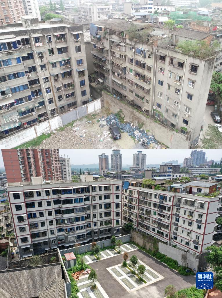 拼版照片:上圖是2020年12月1日拍攝的位于四川省樂(lè )山市市中區海棠街道的一處老舊小區(無(wú)人機照片,新華社發(fā));下圖是2023年6月30日拍攝的該小區改造后的房屋外立面(無(wú)人機照片,新華社記者 王曦 攝)。