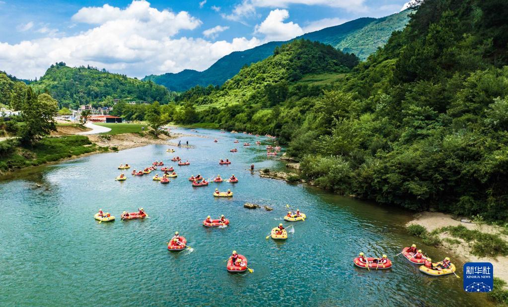 7月1日,人們在貴州省黔南布依族苗族自治州貴定縣洛北河體育公園漂流(無(wú)人機照片)。