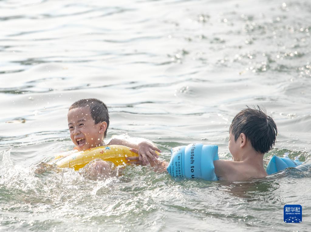 7月1日,在湖南省永州市道縣梅花鎮貴頭村洑水河,小朋友在大人的看護下享受清涼。