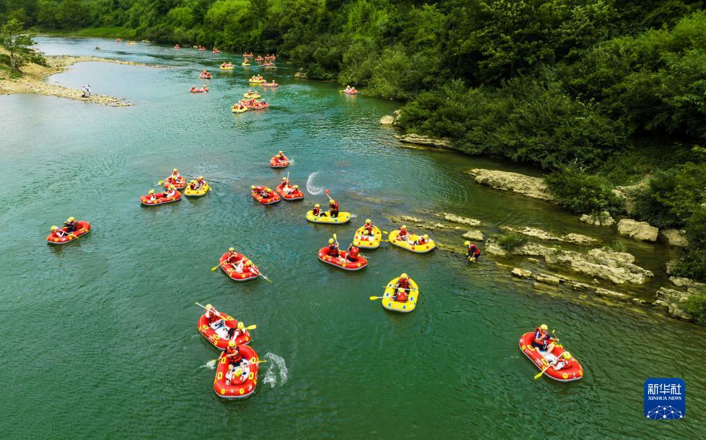 7月1日,人們在貴州省黔南布依族苗族自治州貴定縣洛北河體育公園漂流(無(wú)人機照片)。