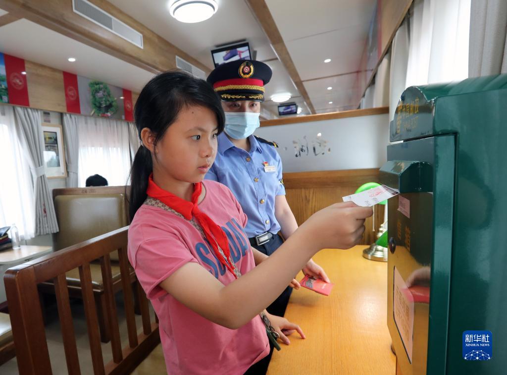 6月30日,鐵路上??瓦\段列車(chē)長(cháng)顧靜佳指導小乘客投遞明信片。
