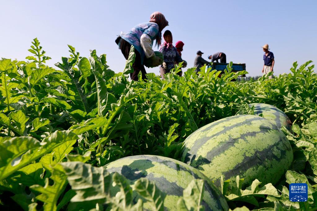 7月1日,河北省唐山市豐南區東田莊鄉亞莊子村農民在搬運采收的西瓜。